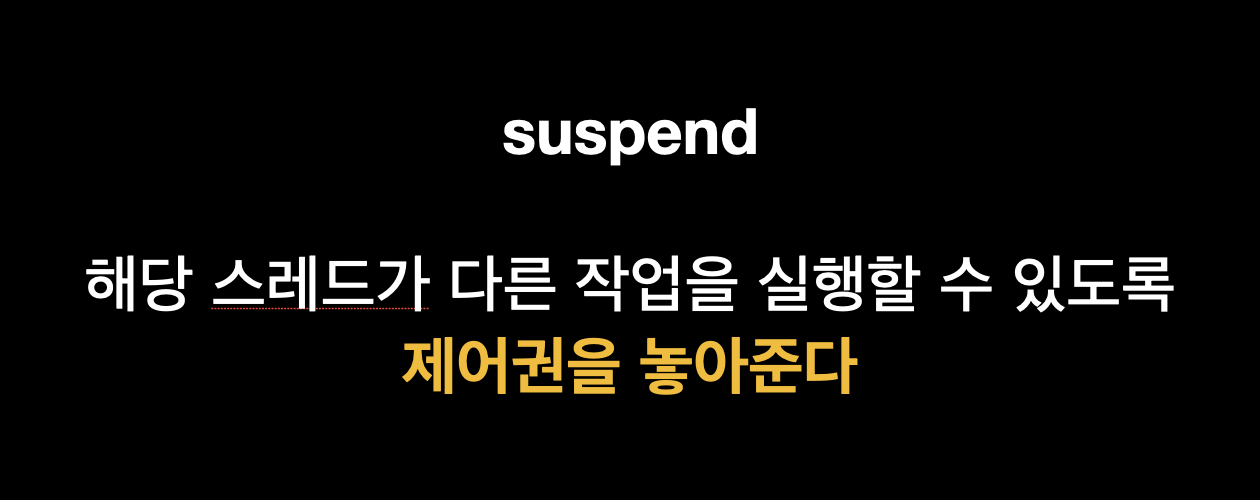 - suspend이란, 쓰레드 제어권을 운영체제를 넘겨 다른 일을 처리할 수 있도록 하는 행위를 말한다.