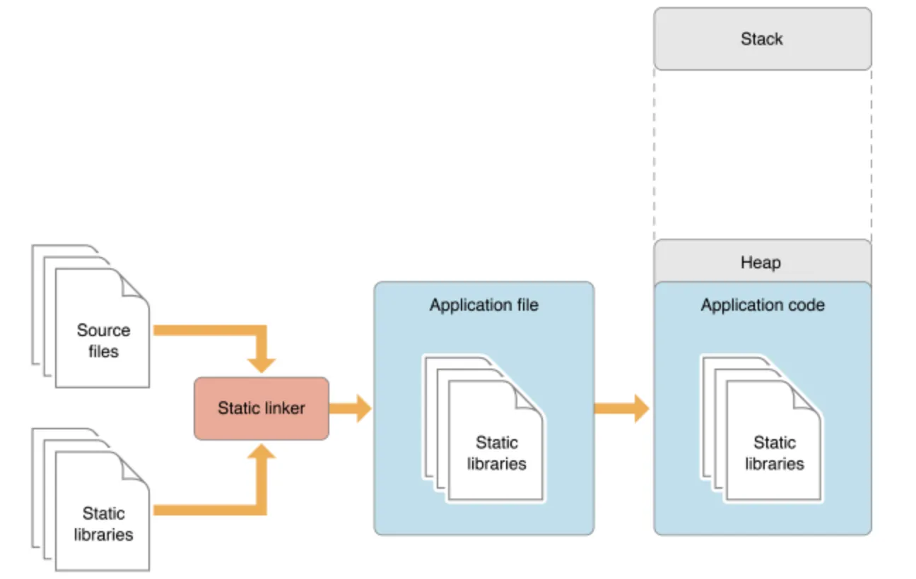 - Static Linker를 통해 Static Library 코드가 Execute file(= appliccation file) 내로 들어가 Heap 메모리에 상주