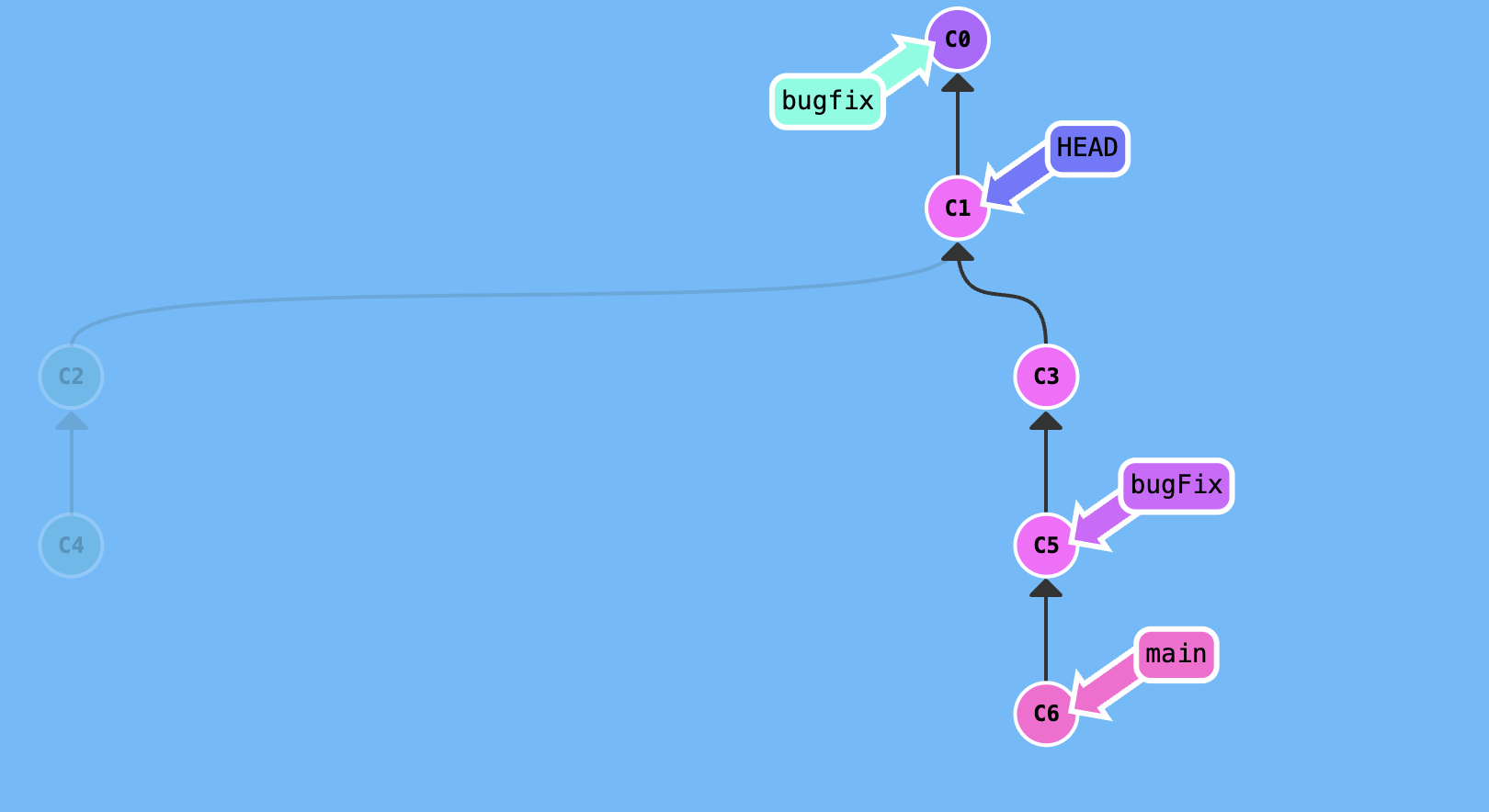 현재 main에 HEAD가 있는데 bugfix 브랜치의 C3 , side 브랜치의 C4 , another C7를 HEAD가 있는 main에