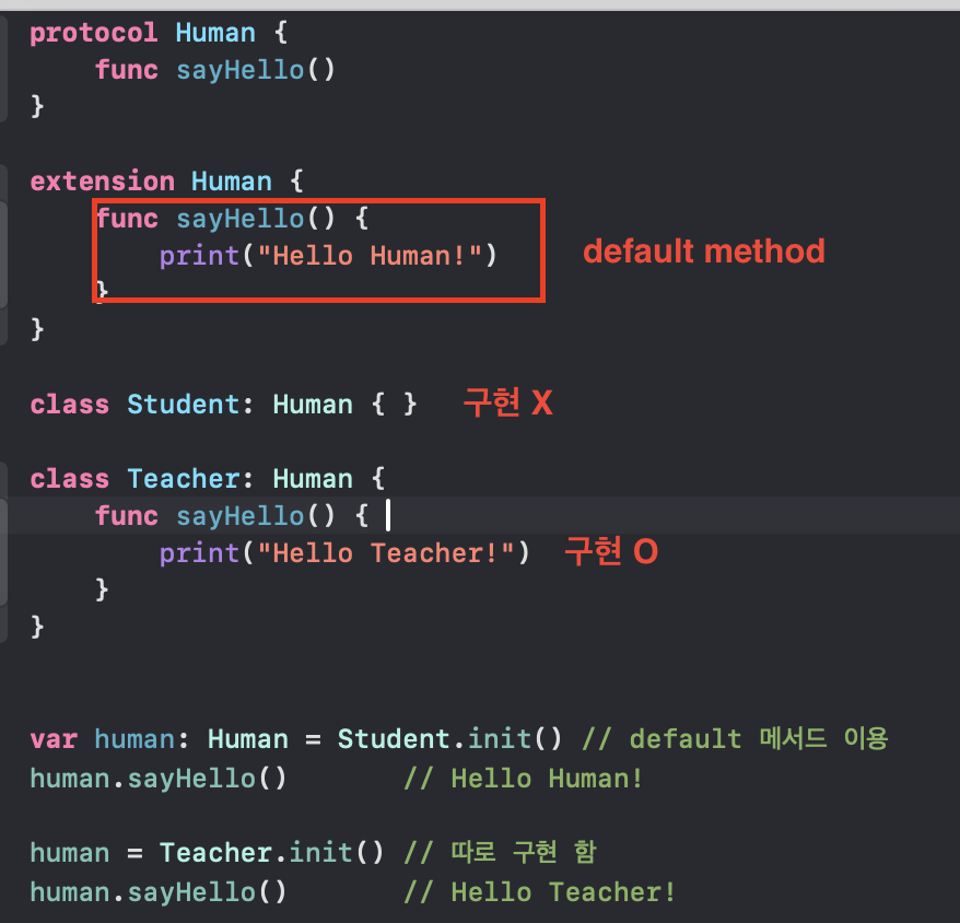 human이란 프로토콜 타입이 Student일 때 default 메서드가 호출되고 Teacher일 때