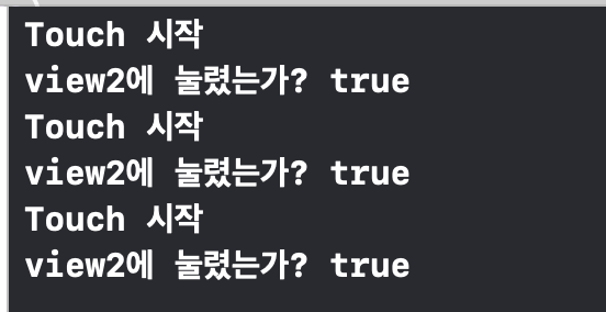 위 처럼 모든 touch 이벤트를 view2에게 할당하게하고 3개의 뷰를 모두 하나씩 눌러봤다