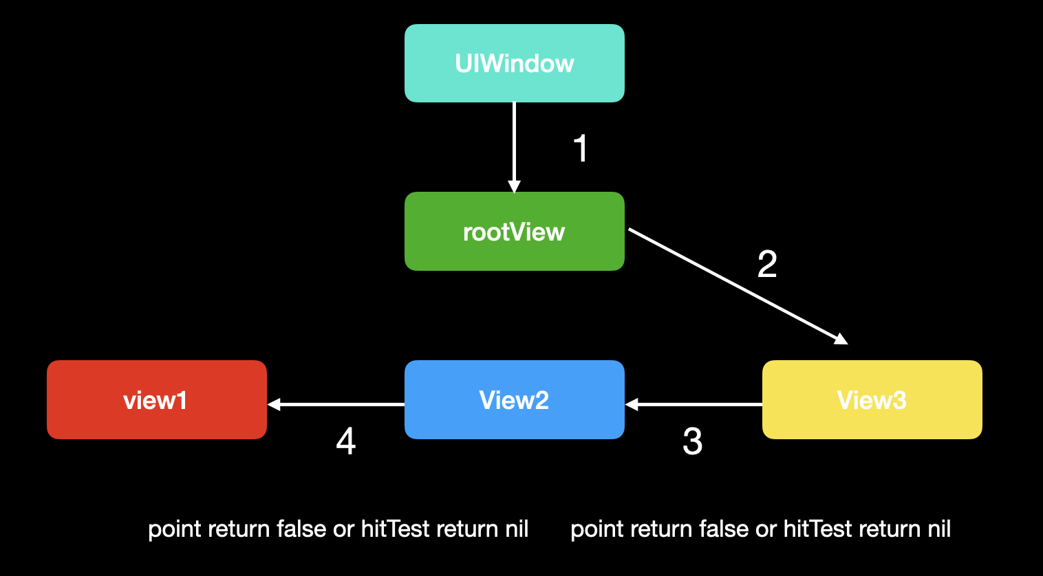 DFS로 가장 아래인 view3으로 간 후 view2 이후 hitTest가 nil이면
