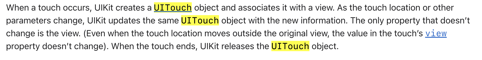 일단 터치를 하면 iOS는 UITouch라는 인스턴스를 만들어낸 후, 특정 View에 종속되며