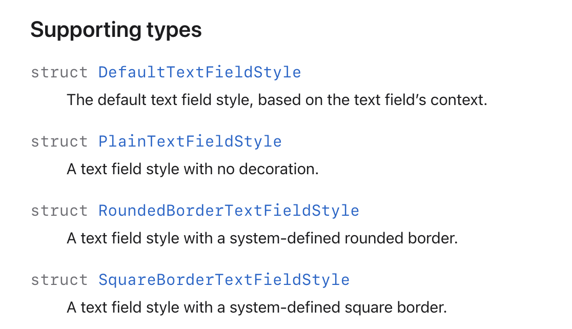 | .squareBorder | SquareBorderTextFieldStyle | 사각형 테두리 (iOS 16+) |