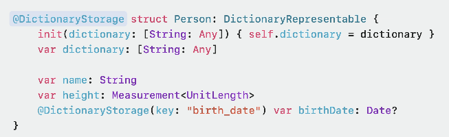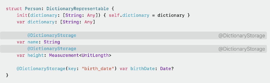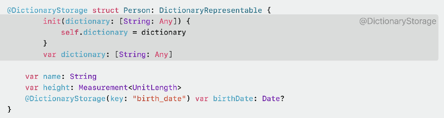아래와 같이 struct 선언문에 붙히면 init와 dictionary 같이 DictionaryStorage 동작이 필요없거나