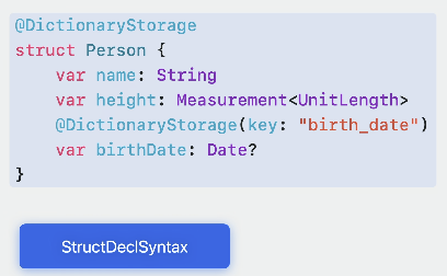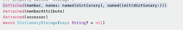 그 다음 이렇게 dictionary에 접근하는 프로퍼티에 매크로를 부착해주면, 다음과 같이 새로운 접근자가 추가(확장)된다.