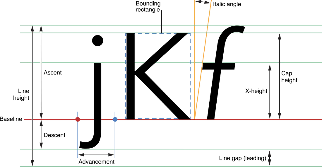 위에서 살펴본 Font Metrics와 비슷한 부분이 많지만, 한번 더 정리해보자.