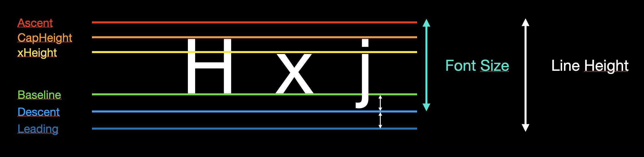 | lineHeight | 한 줄의 전체 높이 = ascent + |descent| + leading |