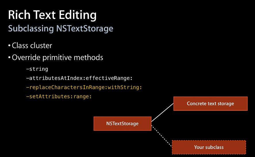 - NSTextStorage는 클래스 클러스터이기 때문에 일부 메서드를 직접 구현 필요