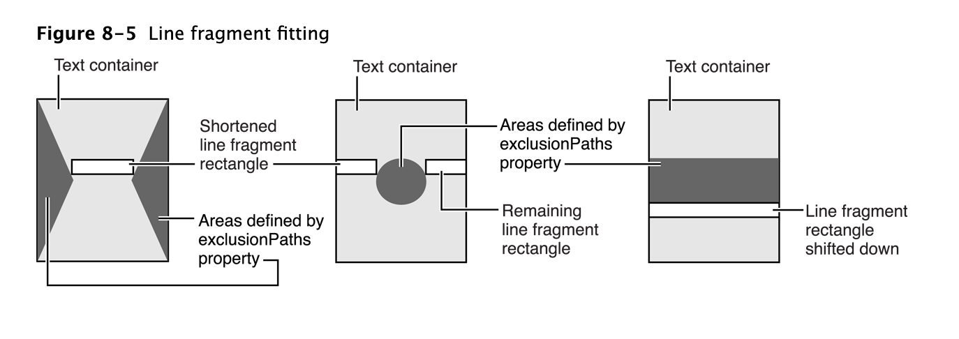 - NSTextContainer는 배치 제외 영역(exclusion paths) 를 UIBezierPath 배열로 유지
