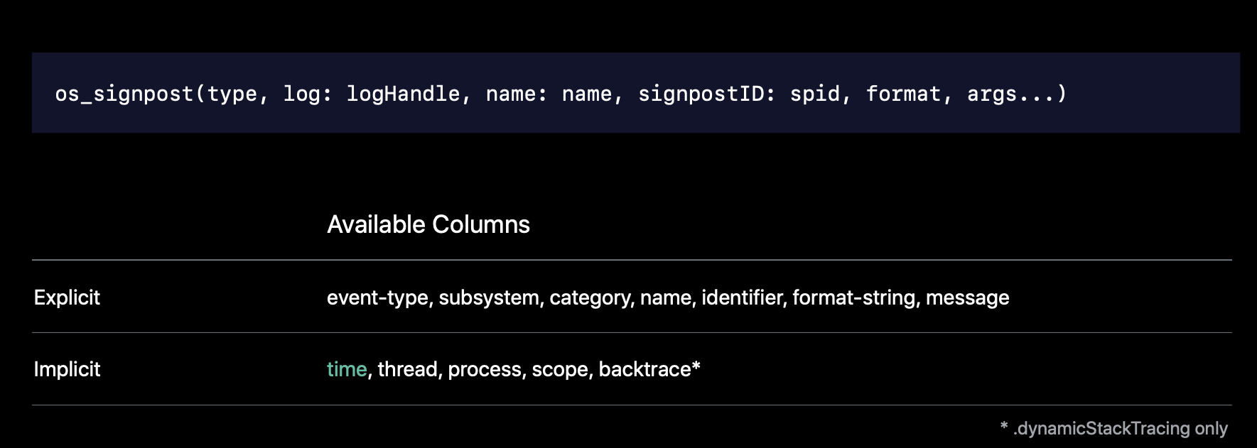 let dynamicStackTracingLog = OSLog(subsystem: "com.org.MyFramework", category: .dynamicStackTracing)