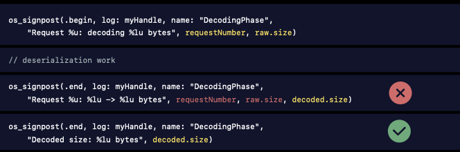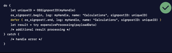 - 시작 또는 종료 이벤트가 서로 다른 스레드여도, signpostID를 통해 이벤트를 일치시킬 수 있다.