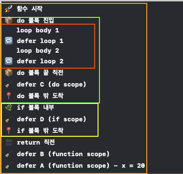 | 반복문 defer | 반복 한 바퀴 끝날 때마다 실행됨 |