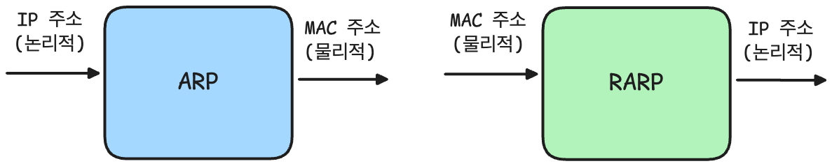 - RARP는 MAC주소를 IP주소로 변환해주기 위해 사용되는 동적 매핑 프로토콜