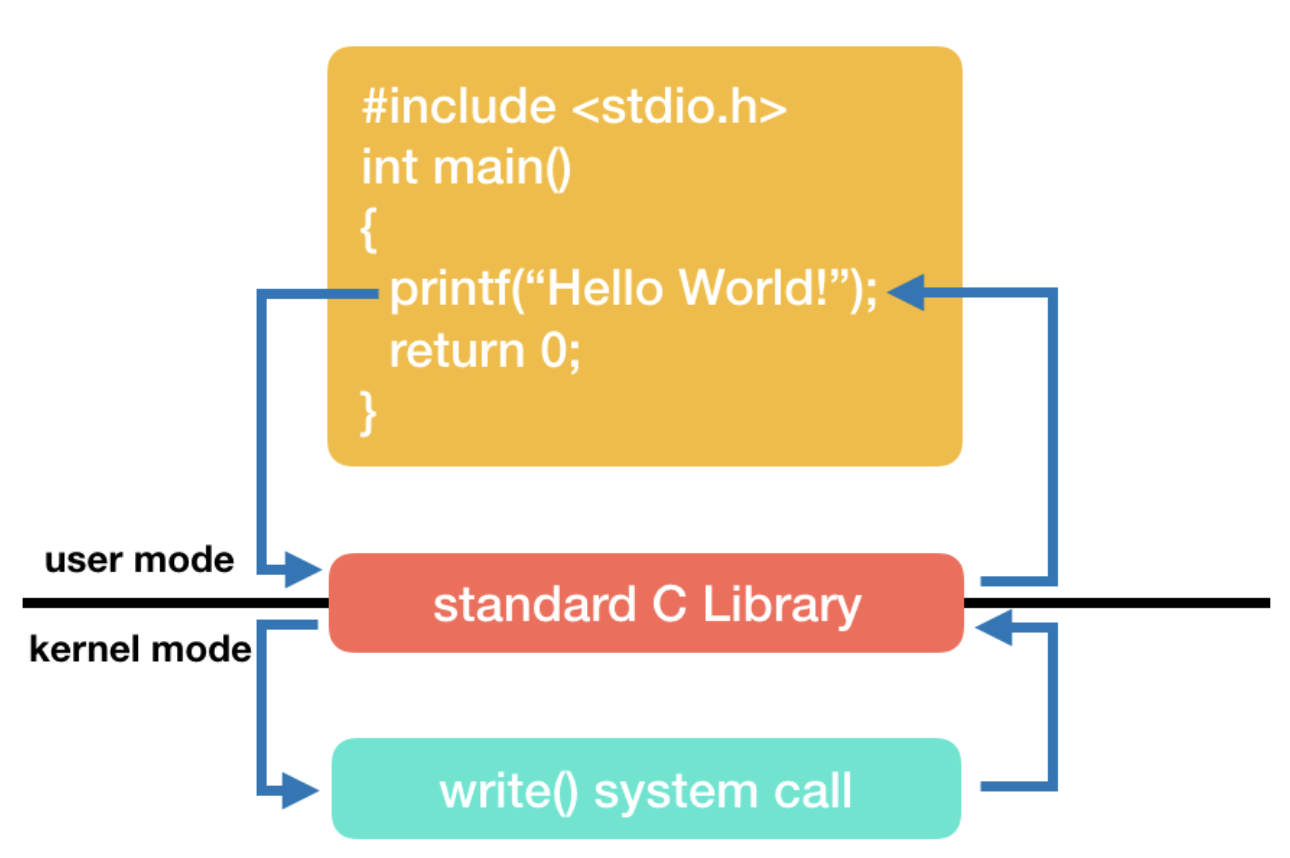 이 때 시스템콜이 유저 모드에서 커널 모드로 modebit을 변경하여 커널 모드에서 내용을 출력한 후