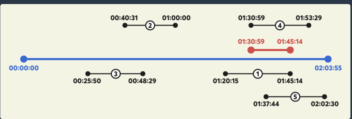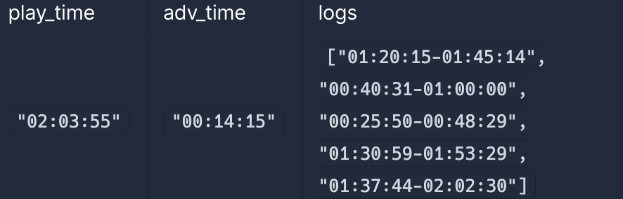 logs: [String] = [startTime-endTime, ....] // 각 유저 별 시청 구간 (1 <= logs 길이 <= 300,000)