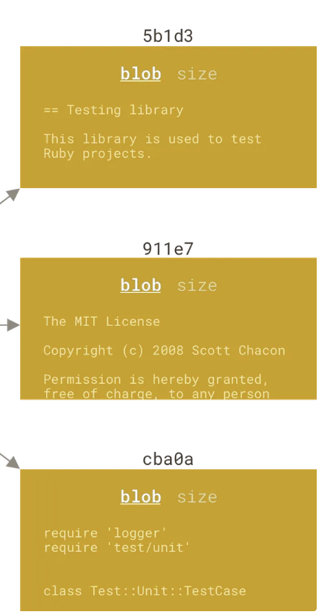 - 바이너리 파일이며, Git DB 에서는 SHA1 hash 로 이름이 지정된다.