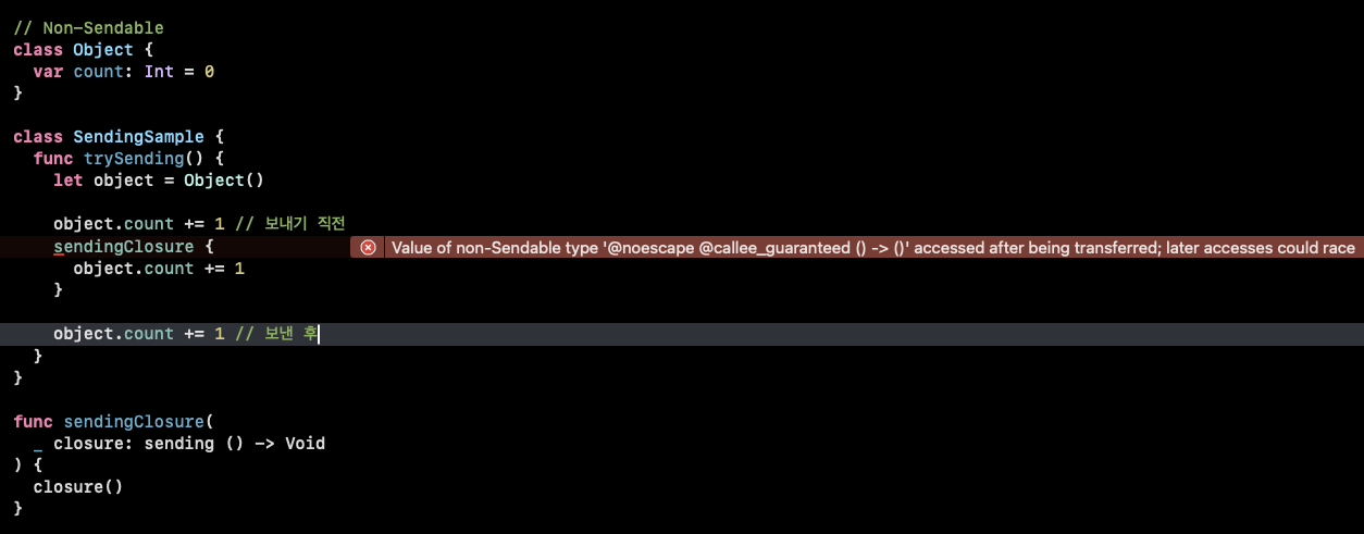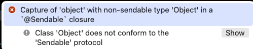 senableClosure 안에서 Non-Sendable한 Object를 캡쳐하니 사진과 같은 컴파일 에러가 발생했다.