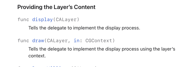 - Delegate 객체는 반드시, display(layer:) 또는 draw(layer: inContext:) 메서드가 구현되어 레이어 객체의 content를 그릴 수 있어야함