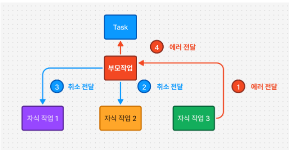 - 암시적 취소: 상우 작업에서 error를 던졌을 때, 아직 하위작업이 남아있다면, 하위 작업도 취소가 전파됨