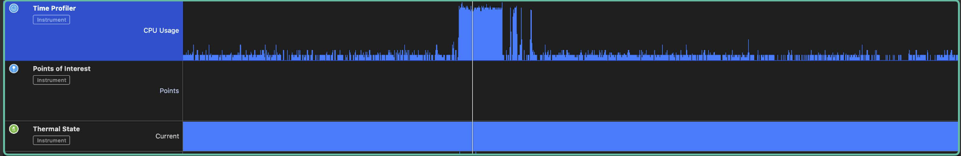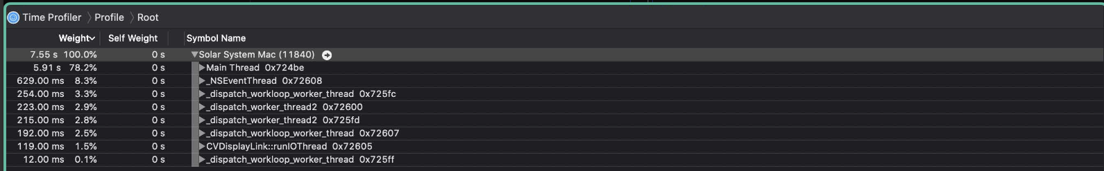 - Time Profiler는 일정 간격에 호출된 스택과 시간간의 상관 관계를 분석하여 통계 프로파일링을 구축