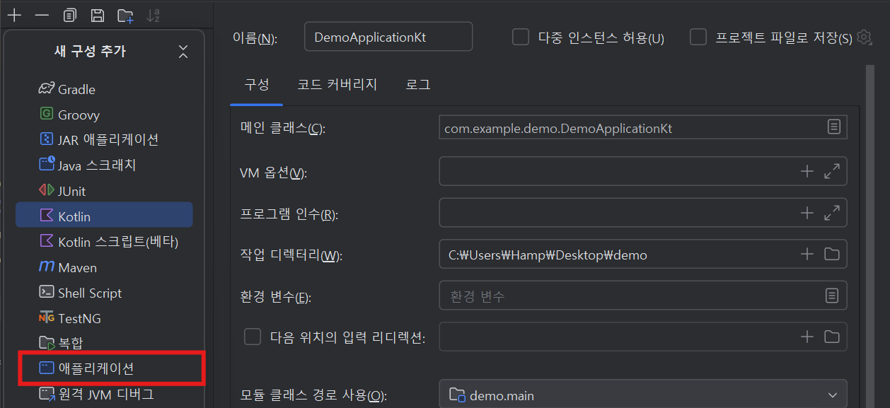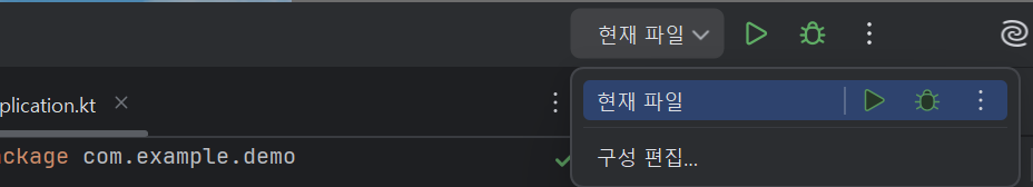 프로젝트를 실행하기위해, 상단을 보면 단순 코틀린 파일 형태의 실행만 추적되고 있다.