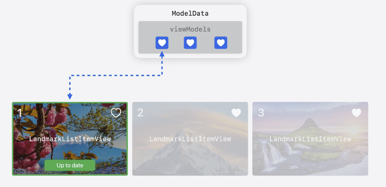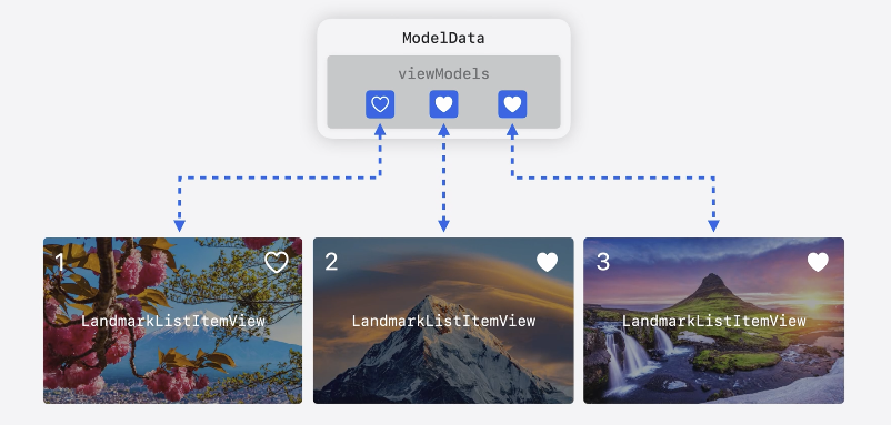 - 배열 전체를 참고하는게 아니라, 각 컴포너트들의 상태를 갖고 있는 ViewModel을 바라본다.