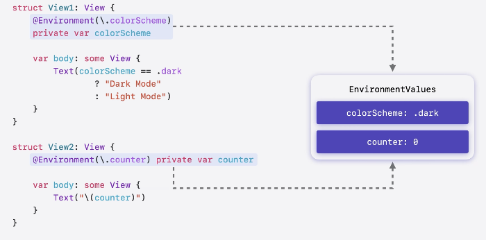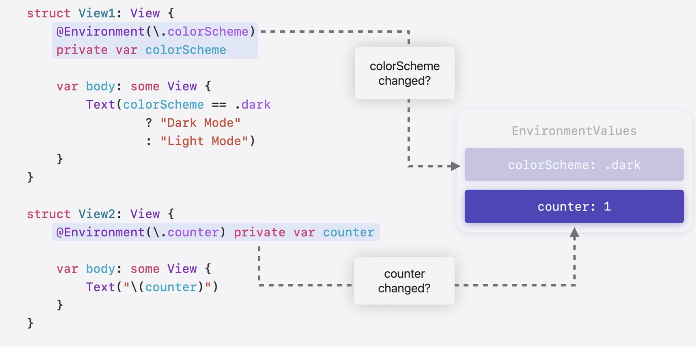- 각 View는 EnvironmentValues 구조체에 종속성이 생김