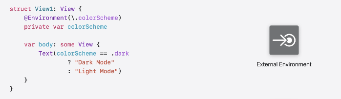 - External Environment: colorScheme처럼 SwiftUI 외부에서 변경가능한 환경 값