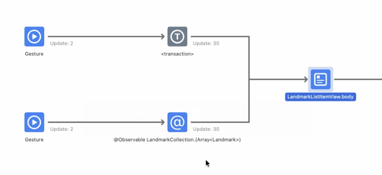 - 탭 이벤트를 토해 LandmarkCollection이 갱신되며, View body가 다시그려지는, Update가 30번이나 됨