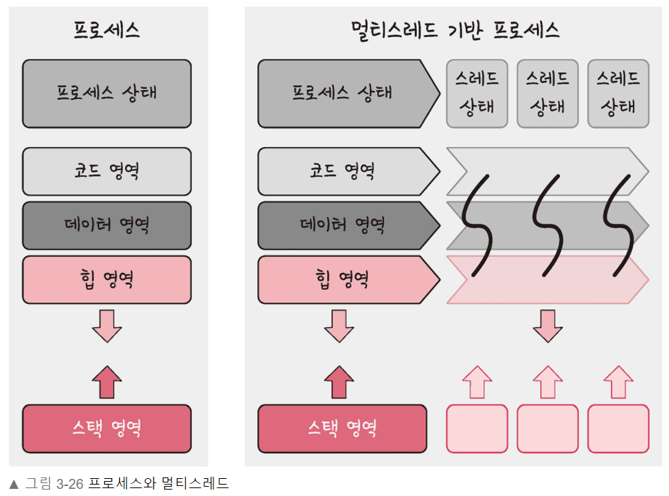 위 그림을 보면 프로세스는 코드, 데이터, 스택, 힙을 모두 독립적으로 할당하지만, 스레드는 스택을 제외한